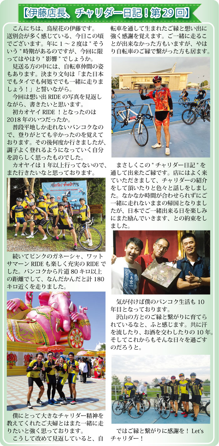 ソイ41の鶏専門店「鳥屋花」の隠れ家で昼飲みも! NakamuraMoriyoshi 5年前 読了時間 1未満 分 週末の昼間に軽く一杯飲むならスクムビット・ソイ41の「鳥屋花(とりやはな)」がお薦めです。 昼飲み(午前11時半~午後2時限定)はとにかく格安で、昼生ビール35バーツ、昼ハイボール35バーツ、昼ワイン50バーツ、芋・麦焼酎35バーツなど。 焼き鳥などの炭火焼きのメニューは夜のみですが、揚げ物や前菜はいつでもオーダーできるので、昼飲みのおつまみにお試しください。鶏出汁の効いた玉子焼きもお薦めです。 ランチのセットは6種類があり、どれも200バーツバーツで税、サービス料なし、ソフトドリンク無料なので、近所にお住まいの人もお昼ごはんに悩んだら「鳥屋花」のランチを思い出して下さい。 ランチメニューは竜田揚げ、チキン南蛮、鶏ももエビチリ、親子丼、鶏そば、鶏ぞうすいの6種類です。 一方、夜はアラカルトメニューとは別に、宴会も可能で、1000バーツポッキリで3時間飲み放題付きのコースがあり、。3階は完全個室16席、2階での宴会は最大30人までOKです。 ラインマンによるデリバリーも継続しています。自宅で焼き鳥を食べたい人は、気軽にオーダーしてみて下さい。 BTSプロンポン駅から歩いて7分。夜ならソイ41の通り沿いに片側駐車可。 持ち帰りも実施中。串盛りも10本で200バーツ!水炊きが2人前350バーツ。親子丼も何と150バーツだからリーズナブル!下の広告参照で。 2021年5月5日タイ自由ランド掲載 Facebookの投稿 Google Map 関連リンク ->鳥屋花のホームページ -> 鳥屋花のFacebook 更新2021/5/5->鳥屋花のページ テイクアウト、デリバリーできる店! ->居酒屋さん ->ランチセット ->宴会によい店 ->炭火で焼くやきとりが食べられる店 ->厳選 ! やきとりがお勧めの店 ->宴会、パーティーによい店 ->個室で落ち着ける店の一覧の一覧 ->炭火で焼くやきとりの店