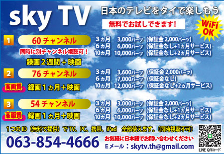 高画質コースで見られるチャンネで54チャンネルコースが加わりました。テレビだけでなく、パソコンやスマートフォン、タブレットでも視聴できます。視聴料金は3ヵ月で3000バーツです。1ヵ月の録画機能付きで新しい映画も見ることができます。日本のテレビを高画質で見たい人向けです。