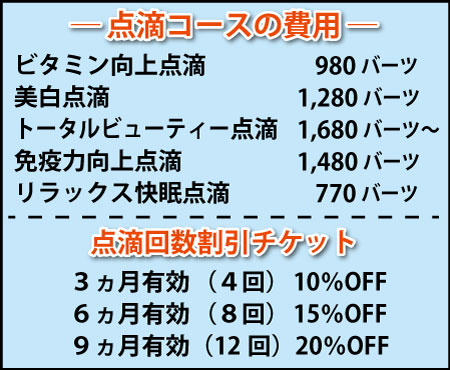 予約しておくと、待ち時間もなくスムーズです。点滴コースはお得な階数チケットも販売しています。4回チケットは10%引きで有効期間は3ヵ月、8回チケットは15%引きで有効期間は6ヵ月、12回チケットは20%引きで有効期間は9カ月となっています。