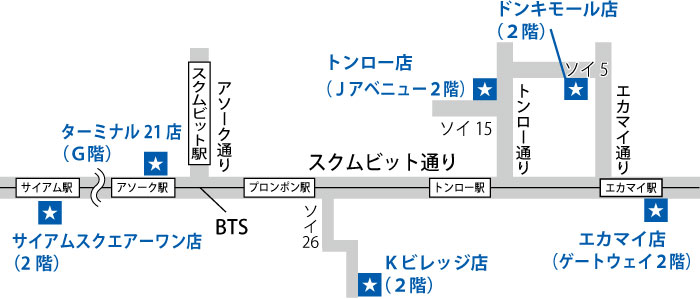 実際に店舗で商品を見るなら、 日本人が多く住むスクムビット界隈には、サイアムのサイアムスクエアワン店、トンローのJアベニュー店、ソイ26のKビレッジ店、ゲートウェイ・エカマイ店、トンローのドンキモール店、アソークのターミナル21店の6店舗があります。