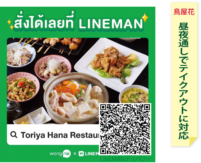 ソイ41の鶏専門店「鳥屋花」では昼夜通しでテイクアウトに対応 NakamuraMoriyoshi 5年前 読了時間 1未満 分昨年の店で食事ができない期間から、ずっと通し営業で連日営業している「鳥屋 花」では、テイクアウトとデリバリーも継続しています。 自宅での食事や晩酌のおつまみはラインマンおよび自社デリバリー(夕方16時以降)でお届けします。 デリバリーは店内で飲食できるメニューがほとんどOKで、近くに住む人なら電話で注文してしばらくしてから取りに行くのもいいでしょう。 スープが絶品の「水炊きセット」は2人前で350バーツ、焼き鳥盛りは10本で200バーツなど、かなりお得な価格設定となっています。ラインマンはさらに安くなっているので、下記QRコードをスキャンしてアクセスしてみて下さい。 店の場所はBTSプロンポン駅から歩いて7分。夜ならソイ41の通り沿いに片側駐車可。 2021年5月20日タイ自由ランド掲載 Facebookの投稿 Google Map 関連リンク ->鳥屋花のホームページ -> 鳥屋花のFacebook 更新2021/5/20->鳥屋花のページ テイクアウト、デリバリーできる店! ->居酒屋さん ->ランチセット ->宴会によい店 ->炭火で焼くやきとりが食べられる店 ->厳選 ! やきとりがお勧めの店 ->宴会、パーティーによい店 ->個室で落ち着ける店の一覧の一覧 ->炭火で焼くやきとりの店