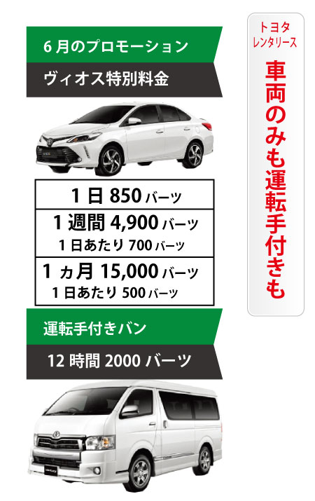 日本人が対応する「トヨタレンタリース」では、6月のプロモーションとして、ヴィオスの車両レンタルを特別料金で承っています。