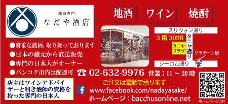 なだや酒店はスクムビット直営店でカフェも営業中、日本直送の日本酒や焼酎、ウイスキーなど超特価の商品も多数! NakamuraMoriyoshi 4年前 読了時間 2 分バリスタが常駐するこだわりのコーヒーも楽しめます コーヒー以外には煎茶やほうじ茶、玉露などもある salon du japonisant by Bacchusなだや酒店直営の酒販売店 壁の向こうのさらに奥が入り口です 4合瓶サイズのお酒を買うと紙袋に入れてくれます 日本のおいしいお酒をタイで広めることをポリシーに酒類の販売をしている「なだや酒店」。度重なる店内飲酒規制に伴い、直営のバーを酒販売店にリニューアルしたのは、前回お伝えしましたが、実際にお店に行ってみたので詳細をお知らせいたします。 まず、もともとがバーなので、外から見ても酒販売店とはわかりにくいかもしれません。花かるたの隣にある角のお店で、壁に直売とデリバリーのビラを貼っているので、これを目印として探して下さい。 店内には珍しい日本からのお酒や焼酎、ウィスキーなどを陳列していて、一部商品を除いて特価シールのついていないものは、全品20%引きとなっています。 特価シールの付いているものは、30%引きや40%引きも当たり前の超特価となっているものが多数あります。ボトルのデザインが気に入って、以前から欲しかった某商品がなんと半額以下で売られていたので、即購入しました。 タイではお酒に関する広告がとても厳しく、銘柄や値段を詳しくお知らせできないのが残念ですが、自宅で飲むお酒の種類や幅を増やしたい人は一見の価値ありです。 タニヤプラザ3階のなだや酒店でも同じく割引きプロモーションをしているので、ぜひ立ち寄ってみて下さい。 ところで、ソイ39の直営店では、バリスタの淹れてくれるコーヒーも楽しめますが、バーの雰囲気そのままの店内はオシャレなカフェとしても申し分ありません。 なだや酒店の社長は日本酒利き酒師やソムリエの資格保持者ですが、コーヒー通でもあるので、こだわりのコーヒーも提供するようになったそうです。店内のお酒をいろいろ見たついでに、日本のコーヒーを注文して淹れてもらいましたが、自分で淹れるコーヒーとはまったく違うのに驚きました。カップをお湯で温めるとか、ドリップする際のお湯の注ぎ方など、見ているだけでとても参考になりました。 店内飲酒が出来るようになっても、宴会や接待、帰宅時の会食などが自粛傾向にありますが、自宅での晩酌に日本直輸入のお酒を楽しんでみて下さい。 お酒に関する相談などは、なだや酒店のフェイスブックへメッセージかEメールでどうぞ。 2021年6月5日 タイ自由ランド掲載 Facebookの投稿 関連リンク -> なだや酒店のFacebook 更新2021/6/5->なだや酒店のページ -> 食材卸-お酒 -> 宅配、デリバリー、配達