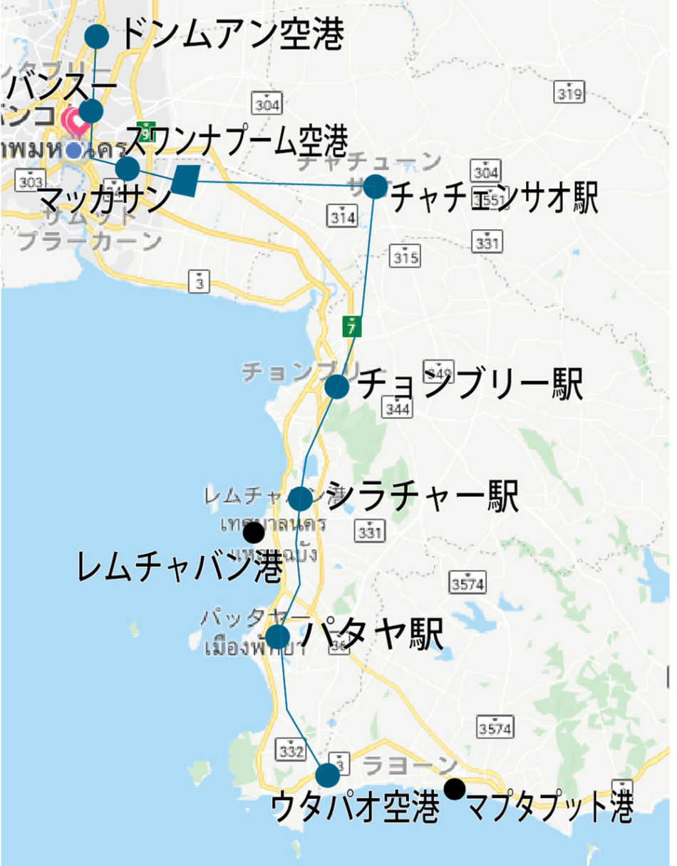 3空港を結ぶ高速鉄道は、CPグループによる建設が決定しているが、タイ国鉄道によると、スワンナプーム空港~ウタパオ空港の170kmにおいて、関係の土地等を明け渡しているとして、現在、設計等が始まっており、本格的な建設がこれから始まり、完成まで4~5年かかるとしている。