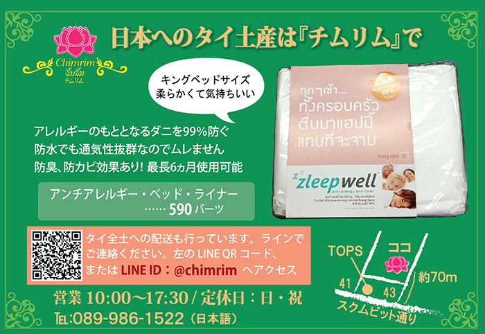スクムビット・ソイ43のタイ雑貨店「チムリム」では、通気性と防水性に優れた「アンチアレルギー・ベッド・ライナー(590バーツ)」も人気商品となっています。マットレスとベッドカバーの間に敷くことで、アレルギーの元になるダニを99%防止いたします。効果は最長6ヵ月持続するので経済的です。