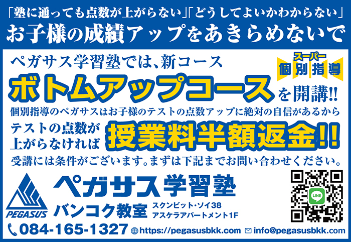 トンロー(スクンビット38)の「ペガサス学習塾」では、新コース「ボトムアップコース」が開講しました。