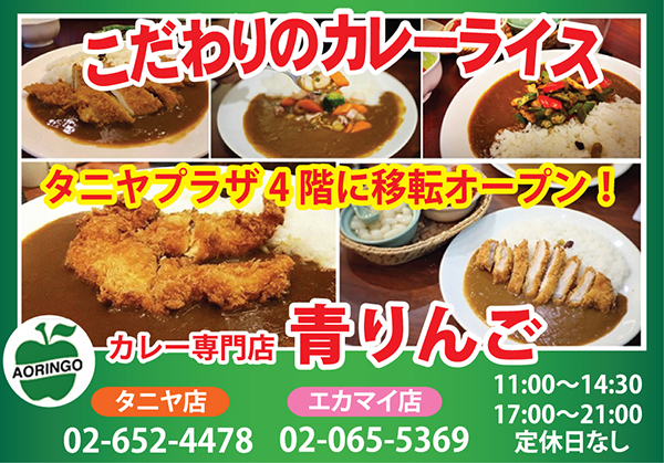 タニヤとエカマイに2店舗を構えるカレー専門店「青りんご」ですが、タニヤ店がタニヤプラザ4階に移転してオープンしています。BTSサラデーン駅直結のBTSウィングが改装のため閉鎖中しているので、駅から店へ向かう場合は一旦下まで降りて、タニヤプラザ正面入り口から入館して下さい。店内のエスカレーターかエレベーターで4階へどうぞ。