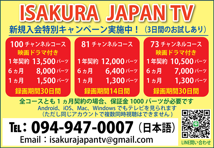 タイで日本のテレビ番組を見るなら「イサクラジャパンTV」でどうぞ。