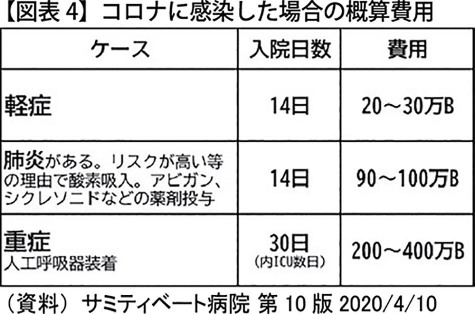 コロナ感染者数は、2021年7月15日現在、世界で累計1億8,836万人に達した(図表2)。 インドでは、2021年3月からデルタ株が猛威をふるった。インドの報道によると、医療施設はどこも殺到する患者、病院にかかれない患者も激増し混乱が続いた。そこで注目されたのがイベルメクチン。この使用を最初に行ったのがインドの最大州(2億1,700万人)のウッタル・プラデシュ州で、その効果を見て他の州も独自に治療基準を改訂し、イベルメクチンの使用を打ち出すようになった(論座2021/6/18)。その効果もあり、2021年6月末にはインドのコロナ感染は急速に収束している(図表3)。 その後、インド弁護士会はイベルメクチンの使用を推奨しない世界保健機関(WHO)の幹部を、世界に向けて「告発」する行動に踏み切っている(注1)。 コロナ感染時の医療費はどれくらい? タイ・バンコクのサミティヴェート病院では、「みなみ先生の新型コロナよろず相談」で感染拡大状況に合わせた政府方針・同院対策の情報が日々更新されている。陽性患者入院治療費の目安として、コロナ感染時の概算費用が出ている(図表4)。これによると、仮に重症化してICUに長期に入院せざるを得なくなる場合には1,000万円近い多額の医療費がかかるという。 タイ政府はタイ入国時に10万ドル保険をかけるよう言っているが、その数値はある意味妥当な数字なのかもしれない。