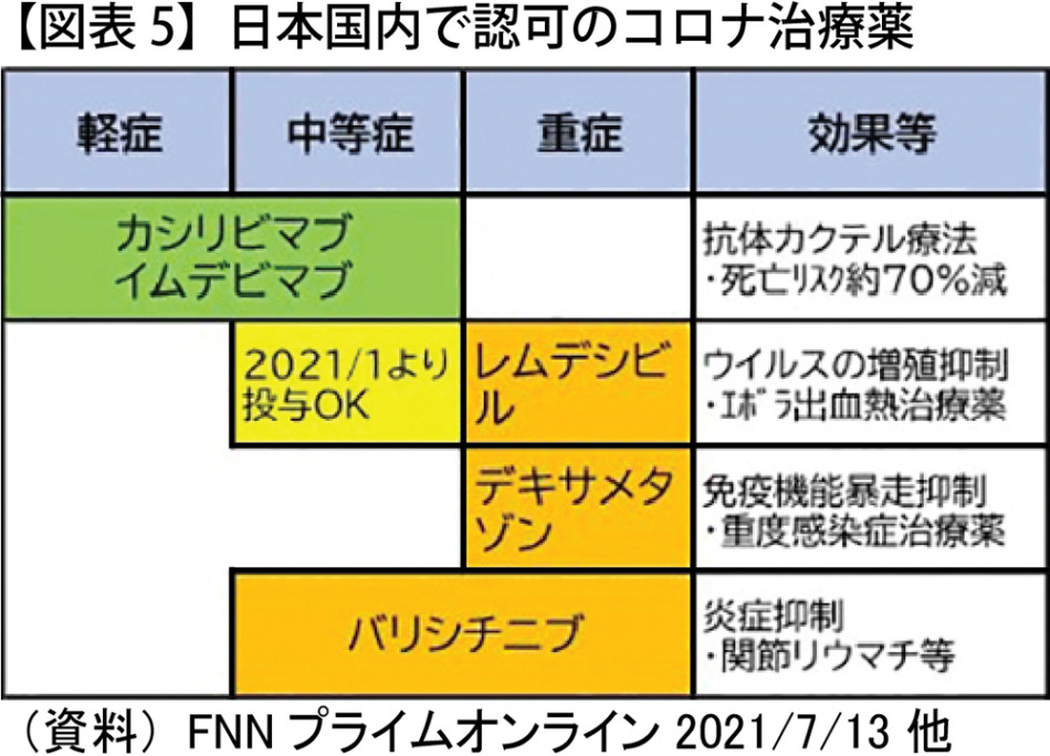 世界中で、ワクチン接種は進んでいるが、コロナ禍以前の日常を取り戻すには、様々な症状に対応した治療薬が不可欠であろう。 厚生労働省は、中外製薬承認申請のコロナ治療薬を、早ければ7月末までに特例承認する方向という(FNN2021/7/13)。承認されれば、日本国内4製品目の治療薬となるが、軽・中等症では国内初のコロナ治療薬承認となる(図表5)。この薬は、米製薬企業リジェネロン社が開発した、2つの中和抗体「カシリビマブ」と「イムデビマブ」を組み合わせた「抗体カクテル療法」と呼ばれる点滴薬で、米国トランプ前大統領が感染した際にも使用されている。海外の治験では、入院や死亡のリスクを7割減らす効果が確認されたという。