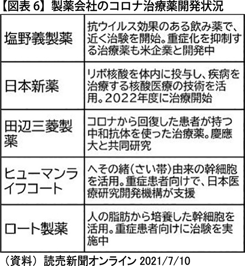 読売新聞によると、中外製薬はほかにも、幅広い症状に対応できる飲み薬の治験を進めている。自社開発した関節リウマチ治療薬「アクテムラ」を新型コロナ向けに転用できるよう、年内にも国内に承認申請する方針という。また、塩野義製薬は、服用から数日でウイルスが消滅する薬の治験を始めたいという。日本トリムの関連会社ヒューマンライフコートでは、へその緒に含まれる幹細胞を使って重症者の治療に使える薬を開発しているという。日本の製薬各社はコロナ治療薬の開発で、世界に巻き返しを図っている(図表6)。 (注1)WHOはイベルメクチンについて、2021年3月31日「証拠が非常に不確実」の理由で「新型コロナにイベルメクチンを使うべきではない」という指針を発表した。当初、インド連邦政府や州政府の多くはこの指針に従い、使用を禁止する州も出るなどして、同薬の使用に遅れが生じたが、感染急拡大を受けていくつかの政府は独自に治療基準を改訂し、イベルメクチンの使用を打ち出すようになった。