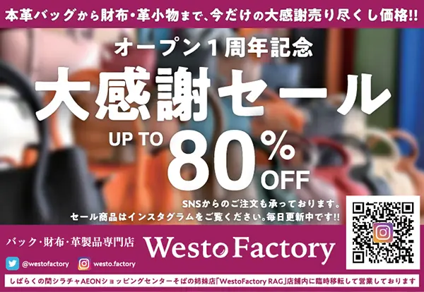 バッグ・財布・革製品の専門店「Westo factory」でオープン1周年記念セール