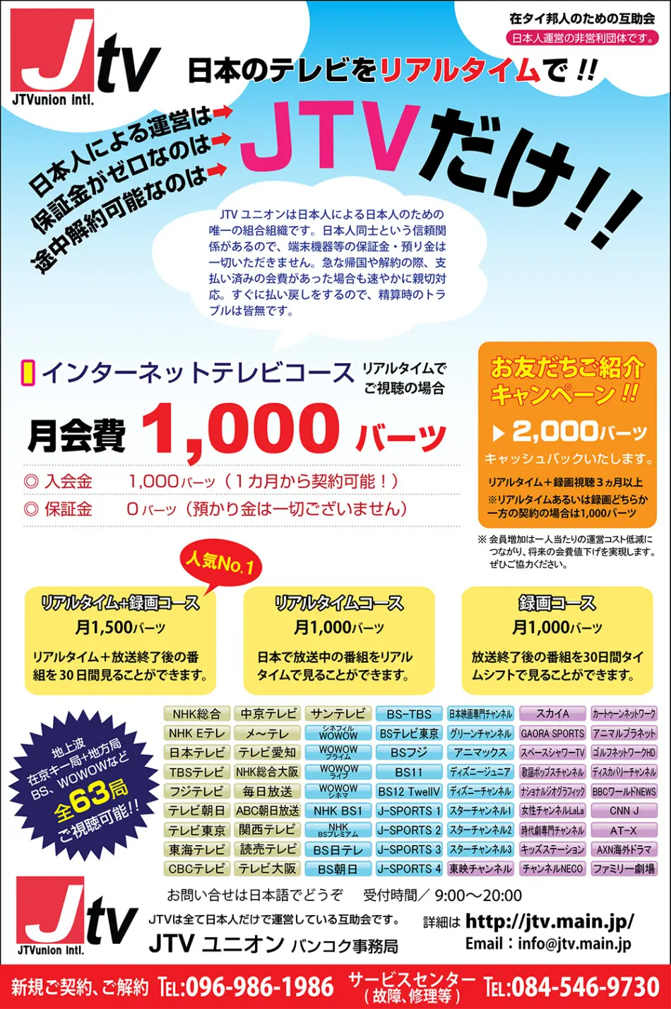 JTVユニオンでは、お友達紹介キャンペーンも実施中です。会員から紹介された人がリアルタイム+録画視聴で3ヵ月以上の契約をされると、紹介者に2000バーツをキャッシュバック(リアルタイムあるいは録画どちらか一方のご契約は1000バーツ)いたします。