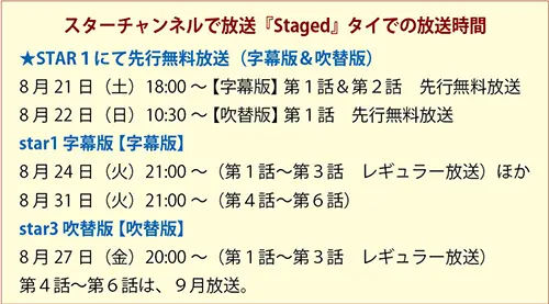 スターチャンネル1(字幕版)では、8月24日(火)の21時から、8月31日(火)の21時から、それぞれ3話ずつ放送されます。 日本語吹き替え版専門チャンネルのスターチャンネル3では8月27日(金)20時から3話続けて放送、4話以降は9月の放送となります。