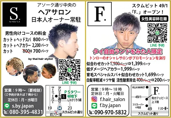 アソーク通りのどまん中にあるタイ在住日本人に大人気の若返りヘアサロン「S.」とトンローで経験豊富な日本人女性美容師が在籍する似合わせサロン「F.」。