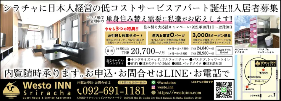 コロナ禍で急増の単身住み替えに最適物件シラチャのサービスAP「Westo INN Sriracha」で入居者募集