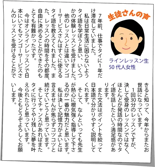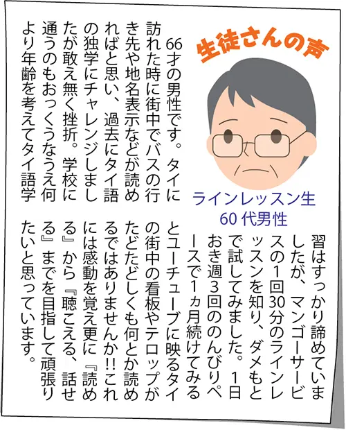 1回30分という短時間から始められる「マンゴーサービス」のタイ語ラインレッスンは、忙しい人にも好評です。なかなか決まった空き時間がないという人も、まずは問い合わせてみて下さい。