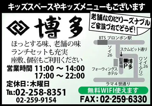 スクムビット・ソイ26にある日本料理店「博多」のホームページにはデリバリーメニューや店内メニュー、また、キッズルームやお子様のおもちゃ等、細かくお店の事がアップされています。