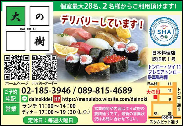 店内に個室が8部屋あるトンロー・ソイ11の「大の樹」では、コロナ対策も万全です。 個室の利用があった場合は、最短で30分は空けてから次の利用となっており、店内の消毒も1時間ごとに行います。 ディナータイムは17時からのオープンですが、当日30分前までに連絡すれば、16時から対応してます。個室利用の店内飲食については、気軽に問い合わせて下さい。 カウンター以外、完全個室で、4人向け3部屋、6人向け5部屋。カウンター席をのぞいて、全席個室なので、仕事帰りの駐在員の利用などにも便利。 また、9月も日替わりおまかせ弁当を継続しています。お得な回数券を販売しており、価格は10枚で2,000バーツ、1食200バーツ。通常300バーツ以上のお弁当を奉仕価格でお召し上がりいただけます。 日替わり弁当も厳選した素材にこだわり、豚肉はブランド黒豚に変更いたしました。また鶏肉もカウヤイの山の中で放し飼いにしている健康な鳥を扱っています。 日替わり弁当のメニューについては、ライン公式アカウントで配信しています。上のQRコードをスキャンして友だち登録してみて下さい。 トンローのソイ11にあり、日本人が多数を占めるプレミア・トンローというサービスアパート内の正面玄関にあります。 下の広告も参照で。