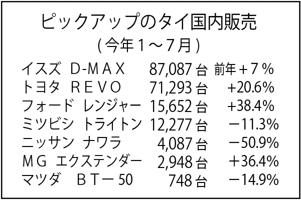 コロナ禍の中での今年1~7月のピックアップ車の販売は、 トヨタモーター(タイランド) の調べでは、イスズのD-MAXが87,087台(前年+7%)、続いてトヨタのREVOが71293台(前年+20.6%)、さらに フォード・レンジャーが15,652台(前年+38.4%)となっており、続いての日本車は軒並み、前年割れで特にニッサン・ナワラは4,087台で前年比-50.9%となっており、その中で好調なのはタイと中国によるMG のエクステンダーが2,948台(前年+36.4%)だった。