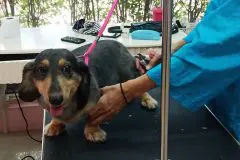 続いてグルーミング中の犬を見せてもらいました。毛をカットして、シャンプーしたり、爪を切ったりしてもらえます。この日は2匹の犬がグルーミングと爪切りをしていましたが、どちらも大人しくカットしてもらっています。