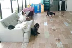 空調の効いた屋内の遊び場の床には滑り止め加工のタイルを使用していて、犬が安全に走り回れるよう工夫しています。室内にはパーティー用の部屋もあり、こちらはキッチン付きでペットと一緒に楽しめるようになっています。