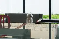 中庭にはイスとテーブルが置いてあり、犬が遊んでいるようすをガラス越しに見ることもできます。はじめて遊びに来た犬の中には、ほかの犬と遊ぶのが楽しくてなかなか帰りたがらない犬もいるそうです。