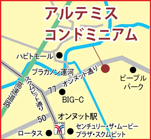 オンヌットの通りソイ77も規模は大きくありませんが、モールがどんどんできています。元々スーパーセンター「BIG C」徒歩圏内にあったこちらの物件、ほとんどの物がこちらで揃えられ、しかも、銀行やインターネットプロバイダーなど入居し、土日祝日も対応しています。ここだけでも充分利用できるのですが、北に300㍍へ行った先に新たなモール「ピープル・パーク」が、できています。ここは日本の居酒屋チェーンや、今はやりの24時間フィットネスなど、行きつけになりそうなお店も多く入店されています。はたまた、運河を超えた先には洒落た店も多い「ハビット・モール」も数年前にはできています。この前を抜けるとモーターウェイにも乗れ、各方面へ素早く向かえます。