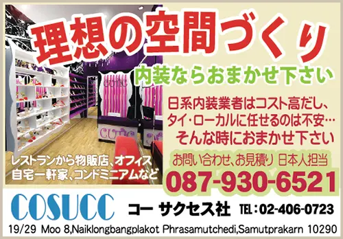 弊社は違います。いかにお客様のご要望でも出来ない事はきちんと伝え、またその理由もご理解頂くまで徹底的に説明します。安全・安心の内装施工は是非「コーサクセス(タイランド)」まで。詳細は下の広告まで。