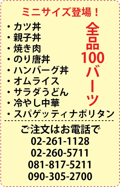 ミニサイズが登場 オレンジハウス注文 宅配弁当でお馴染みの「オレンジハウス」では、新しく小さいサイズの丼と麺の販売を開始しました。全部で9種類、全品どれも100バーツ(税別)となります。子どもにもピッタリのサイズで、小腹が空いた時やもう少し食べたい時にもどうぞ。 新登場のミニ丼と麺は以下の通りです。 カツ丼、親子丼、焼き肉丼、のり唐丼、ハンバーグ丼、オムライス、サラダうどん、冷やし中華、スパゲッティナポリタンの9種類です。 そのほか、店内飲食も可能になり、オレンジハウスではハンバーグ系の定食メニューが充実。 「チーズハンバーグ定食」や、小さめのハンバーグがデミグラスソースで煮込まれた「煮込みハンバーグ定食」もおすすめ。これらの定食はもちろん宅配のデリバリーOKです。 一方、自宅で最後の調理や仕上げをする「オレンジクッキングボックス」はおかずのセットを調味料や味付きでお届けします。炒めるだけ、とか揚げるだけなど、簡単にできるようになっています。下の広告参照で。