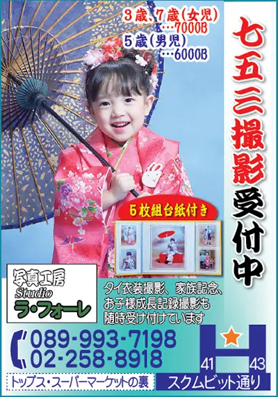 スタジオ「ラ・フォーレ」では、七五三衣装と小物、着付け、メイク、撮影代すべて込みで、女子7,000バーツ、男子は6,000バーツです。豪華アルバム台紙と撮影時の写真すべてが入ったデータCDのおまけも付きます。ご家族との記念撮影も追加料金は一切かかりません。