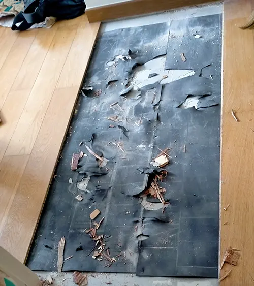 フローリングの床面の高さを揃えるために、修理の時もクッション材を入れました。が、クッション材の裏表に接着剤を十分塗ってもらいブカブカは絶対起きないようにしてもらいました。