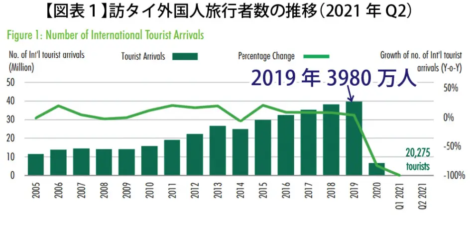外国人旅行者数の目覚ましい増加に伴い、タイの観光業はこれまで長年にわたってタイ経済の主要な役割を果たしてきた。しかし、新型コロナウィルス(以下「コロナ」という)の感染拡大で、ホテル業界は大きな打撃を受けた。 CBREによると、外国人旅行者数は、コロナ前の2019年3,980万人から、コロナ発生後2020年には670万人と前年比83%減少した。2021年上半期は僅か2万人、年間ベースで4万人、ピーク時の99.9%減と激減した(図表1)。