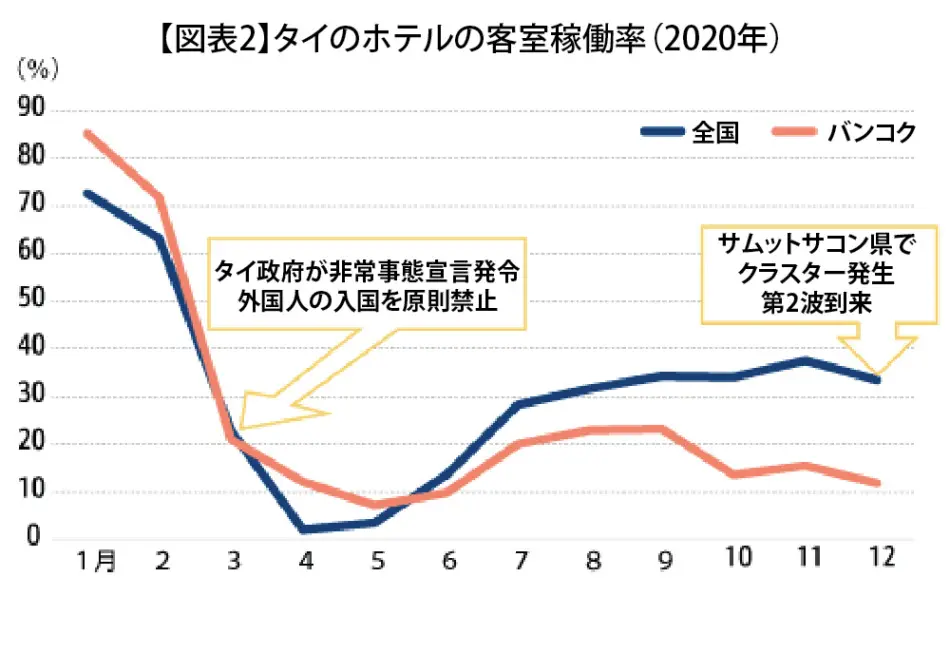タイ国政府観光庁(TAT)によると、タイ国内のホテル客室稼働率は、コロナ発生前の2020年1~2月は60~70%台であったが、コロナ発生後、非常事態宣言発令により外国人入国を原則禁止した4月には2%まで落ち込んだ。その後、国内旅行者の増加に伴い回復基調にあったが、外国人旅行者への依存度が高いバンコクのホテルは甚大な影響を受け、2020年1月の85%から3月には21%まで下落、12月には12%と全国平均をさらに大きく下回っている(図表2)。
