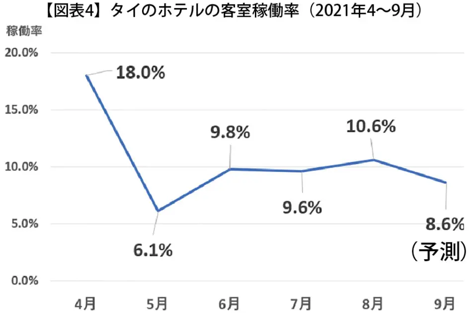 2021年4月以降のコロナ第3波(デルタ株)の発生により、4月頃から観光客がほぼゼロになるなど、深刻な状況となった。タイ・ホテル協会(THA)によれば、ホテルチェーンの半数以上がコロナ前の10%に満たない収益しか確保できず、従業員が次々と解雇されているという(2021/4/21バンコクポスト)。 2021年8月の平均客室稼働率は10.6%まで落ち込み(図表4)、コロナ感染拡大が予想以上に長引いた場合、ホテルの52%が営業を停止すること、9%が廃業することを考えているという(タイ中銀調査8/13-28,全国234ホテル)。