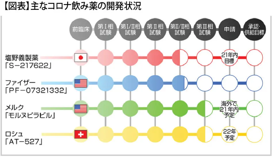 塩野義製薬は、開発中のコロナ治療薬について、2021年3月までに国内外で合計1,000万人分の供給体制を整える方針を明らかにした。国内では年内に100~200万人分の供給体制を整備。加えて海外メーカーへの生産委託などを検討しており、海外向けの供給にも力を入れる。 開発しているのは、ウイルスの増殖を抑制する軽症者向けの飲み薬。感染初期に服用することで重症化を防ぎ、発熱などの症状を改善する 効果が期待されている。国内では、治験が難しい医薬品を発売後に評価する条件で承認する制度「条件付き早期承認」の年内申請を目指している。さらに、米国で来年3月をめどに緊急使用許可を取得する考えだ(時事ドットコム2021年8月25日)。 Apaman5556【図表】主なコロナ飲み薬の開発状況