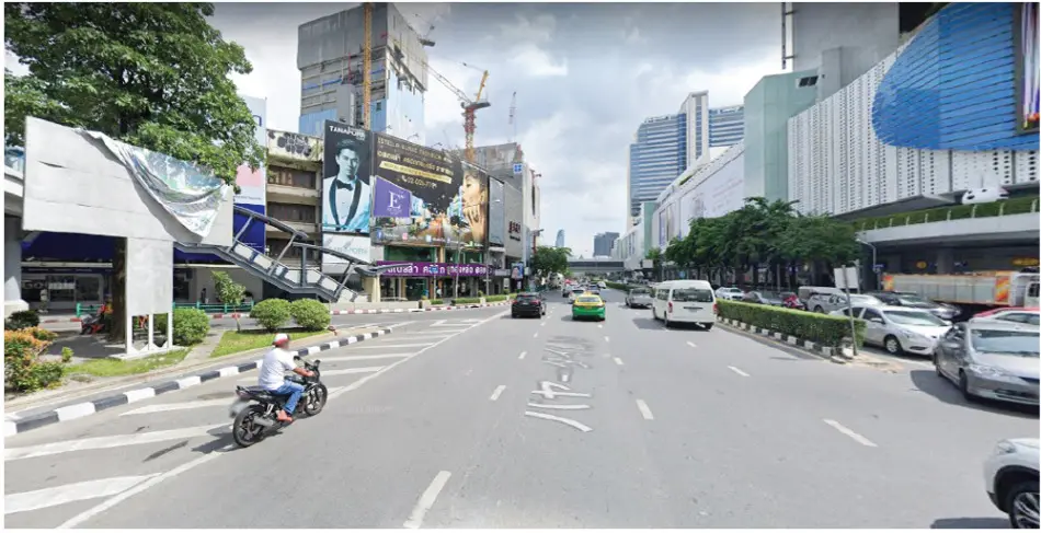 BTSサイアム駅前で。向かいにはサイアムパラゴン、パヤタイ通りをはさんでMBKセンターなどがある商業地区。