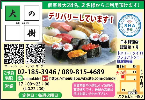 政府が11月1日からSHA(アメージングタイランド健康安全基準)認定されたレストランはお酒を提供してよいとの発表がありました。「大の樹」はバンコクにある日本レストランで最初にSHAに認定されたお店です。 個室が8部屋あり、1時間ごとに店内のしっかりとした消毒はもちろん、個室を使用された場合、少なくとも30分空けてから次のご案内などコロナ対策はしっかりと行います。 また、11月よりメニューを一部変更して品数を減らす一方、食材を一から見直し、サラダの野菜は全て100以上の小さなこだわりのある農家さんが作ったオーガニックの野菜、豚肉は黒豚に変更する、など食材一つひとつのレベルアップします。品目を減らすことによってフードロスを最小限に抑えmより質の高い食材をこれまでと同じような価格帯で提供することができます。 おひとり様でも気軽にオーダーできるように小鉢、小皿料理を追加しました。価格も80バーツ、100バーツ、120バーツと設定いたしました。グループでシェアしたい場合は2人前、3人前とすれば、同じ皿に盛ることもできます。 なお、ランチ営業は11月より一時的にお休みすることにしました。6名様以上のご予約は前日までにご予約いただけましたら受付致します。定休日は毎週火曜日となっています。下の広告を参照で。