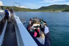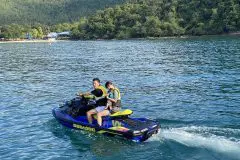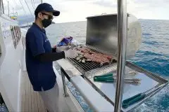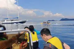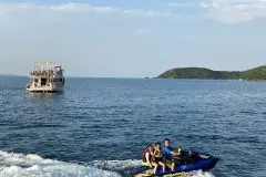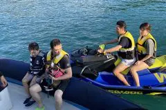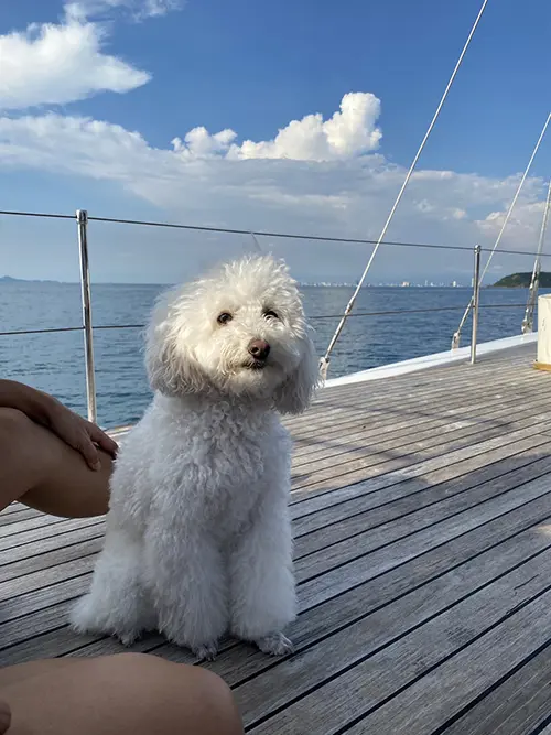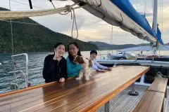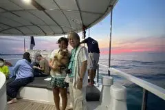 出発直後の雨で、行き先の島を変更することになりましたが、晴天エリアの島に到着し、わんちゃんと一緒にジェットスキーやバナナボートを楽しんだり、船上でバーベキューで家族で楽しんでいただと思います。戻りのサンセットはとても素敵な光景でした。