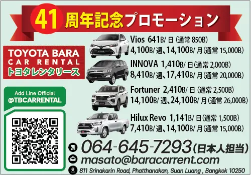 「トヨタ・バラ・カーレンタル」では、41周年を記念して、レンタカーが1日当たり、1週間当たり、1ヵ月当たりでお得!