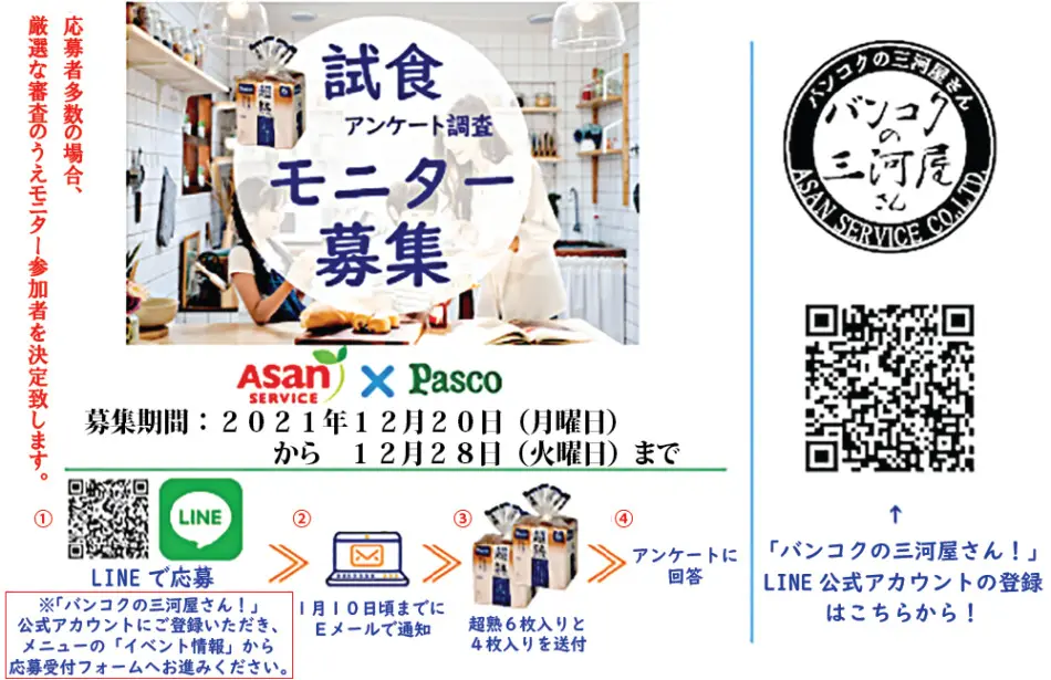 PASCO超熟の試食モニターを募集いたします。アンケートはLINE公式アカウントのメニューから「イベント情報」から応募フォームへどうぞ。募集期間は12月20日(月)から12月28日(火)となっています。応募者多数の場合は、審査のうえモニター参加者を決定致します。