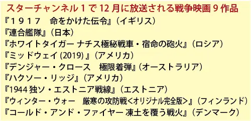 たとえば、JスターTVで見られるスターチャンネル1では、12月11日と12日に世界の戦争映画特集として、各国の9作品を一挙に視聴できます。