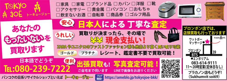 年末の大掃除や引越しで不要になったものなどはプロンポン店隣の買取センターへ持ち込んで下さい。買い取ってもらえるか不安な物については、LINEで写真を送れば査定してもらえます。