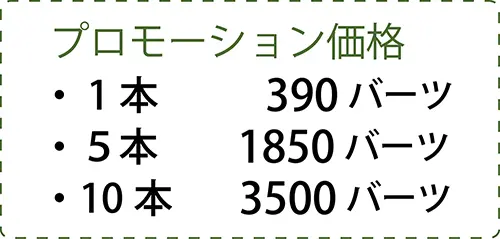 なお、アロエベラリキッドは1本390バーツ。5本以上でお買い上げで1本あたり370バーツ、10本以上だと1本あたり350バーツとお得です。まとめ買いがお得です。