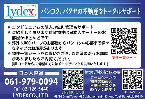 バンコクやパタヤで賃貸物件と販売物件を取り扱っている「リデックス(Lydex)」から賃貸物件のお知らせです。
