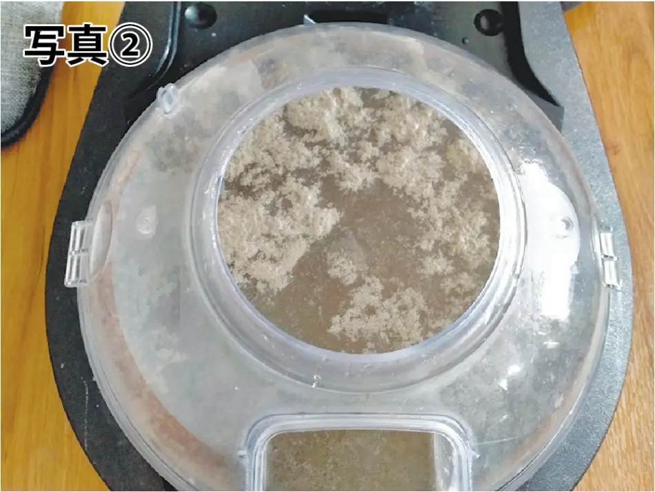 作業は実に丁寧でした。ソファーのクッションの上、下、横、そして、ソファー自体の上、横、裏、ひじ掛けなど、あらゆるところを何回も何回も、専用の強力クリーナーでこすっていました。このクリーナーから吸気した空気は機械の中に入れた水で洗い排気する仕組みになっていました。排気がお部屋の空気を汚さないようにできているようです。ソファーの汚れを吸収した水は、黒っぽく濁り、ほこりが水の上に浮いていました。(写真2)