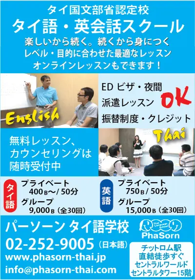 タイ語、英語とも少人数制のグループレッスンから、プライベートレッスンまでコースがあり、学生ビザの取得もできるので、まずは気軽に問い合わせてみて下さい。