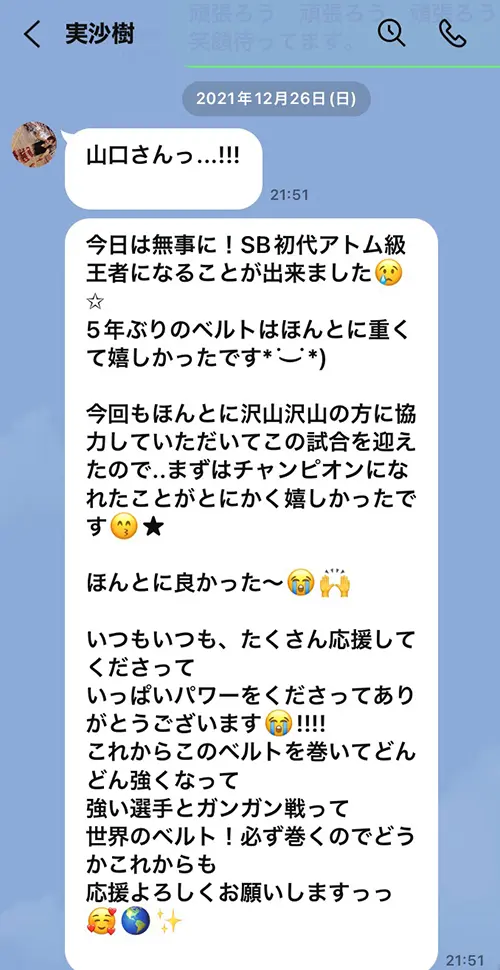 MISAKIはタイ・バンコクに毎年訪れて、ムエタイ選手とのスパーリングも行っている。あぱまん情報の山口社長とも数年来の付き合いで、山口社長もバンコクからMISAKIを応援している。 2021年12月26日試合終了後、MISAKIから喜びの報告がLineで山口社長に届いた。Lineの中でMISAKIは「SB初代アトム級王者になることが出来ました。5年ぶりのベルトは本当に重くうれしかったです。」とあった。山口社長は「次は世界トップを目指してガンバレ!」と伝えていた。