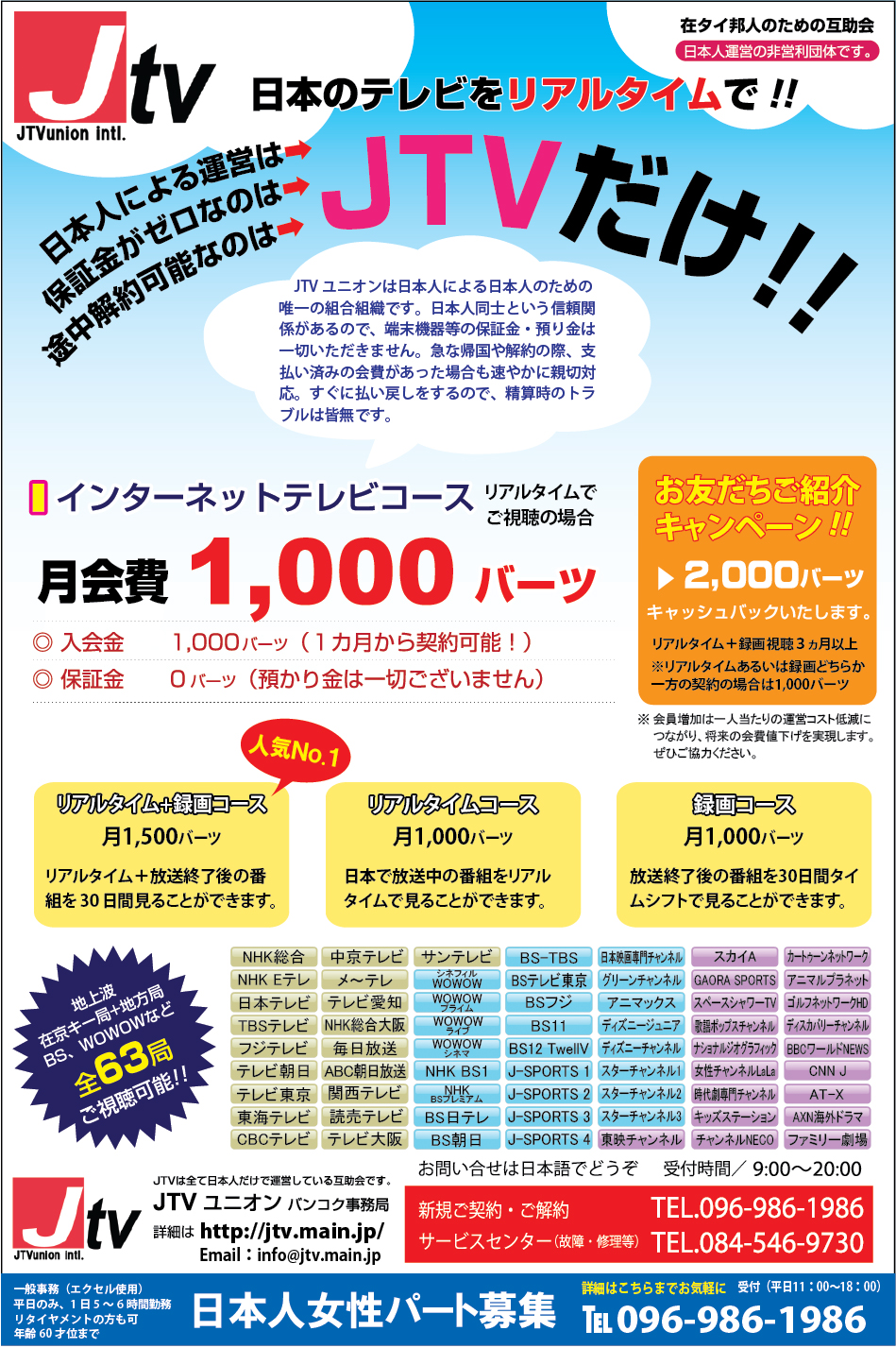 JTVユニオンでは、お友達紹介キャンペーンも実施中です。会員から紹介された人がリアルタイム+録画視聴で3ヵ月以上の契約をされると、紹介者に2,000バーツをキャッシュバック(リアルタイムあるいは録画どちらか一方のご契約は1,000バーツ)いたします。