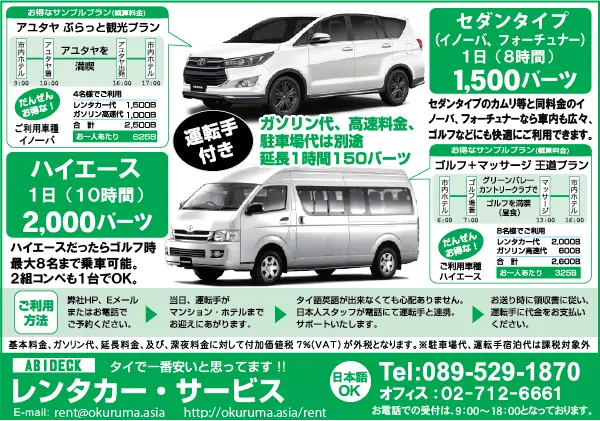 レンタカーは1台当たりの料金なので、人数が増えると1人当たりの料金はお得になります。ハイエースなどのワゴンタイプの車もあり、こちらは1日(10時間)で2,000バーツとなっています。